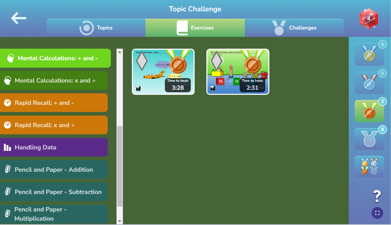 Topic Challenge is a tab that allows students to track their progress throughout the Maths-Whizz curriculum, explore maths topics and exercises outside of their assigned tutoring content, and create challenges. Topic Challenge is accessed through the menu, via the ‘Topic Challenge’ tab. There are three different sections that are found within Topic Challenge:
