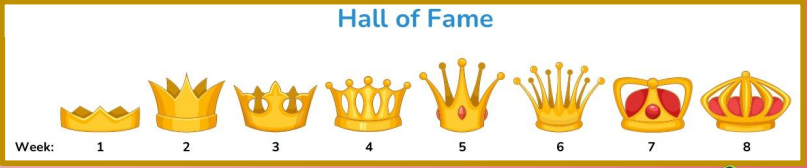 The goal is for students to collect both 3 Blue Progression Gems and 3 Red Retention Gems each week, showing they are learning new content and reinforcing foundational knowledge. To encourage consistency, motivation, and engagement, the more weeks students appear in the Hall of Fame, the better their crown.