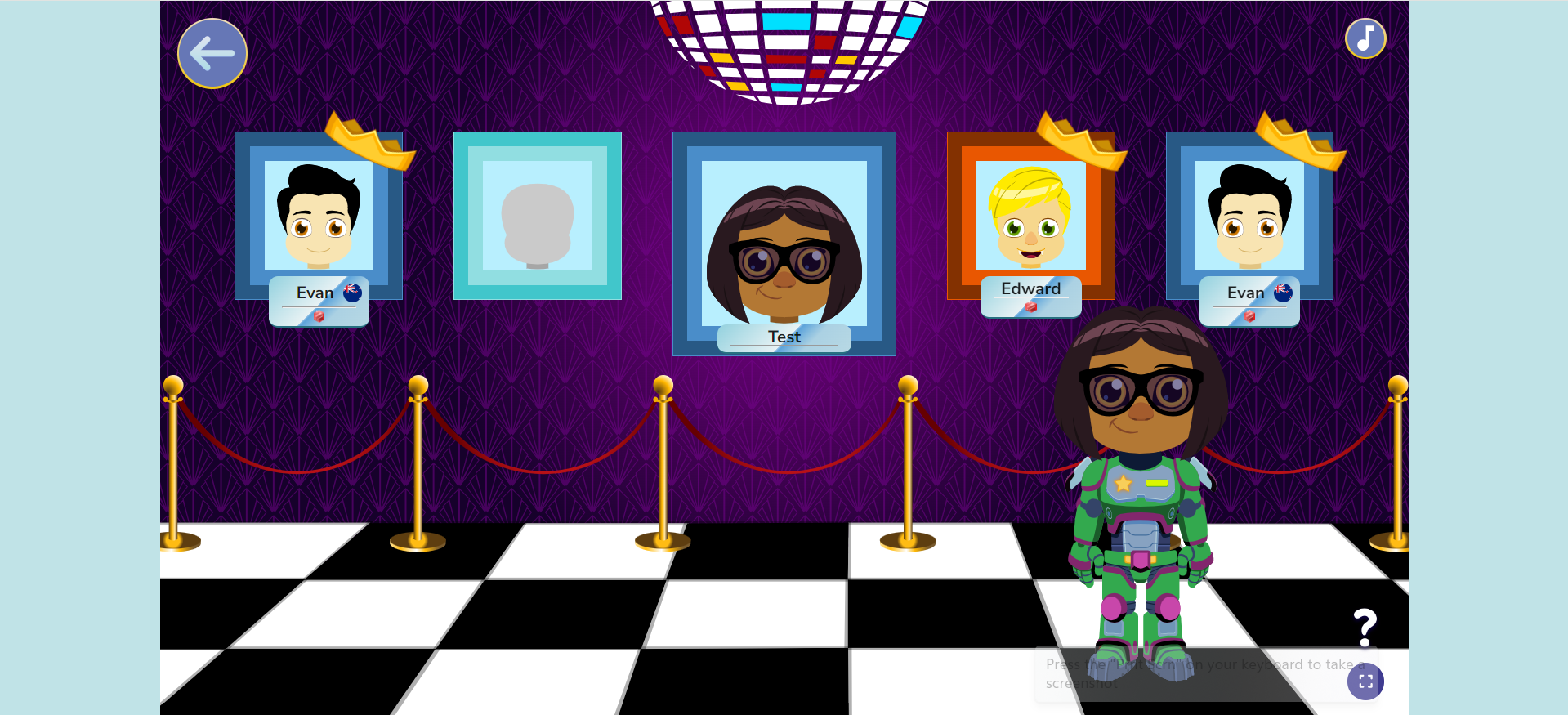 The Hall of Fame displays different students across five windows to encourage and motivate learners. The first window shows buddies from the same class/school, while the second window can include buddies from anywhere in the world, as well as home subscription students. The middle window displays the student who owns the account. The fourth window shows students from the same country and school, and the fifth window displays students from around the world.