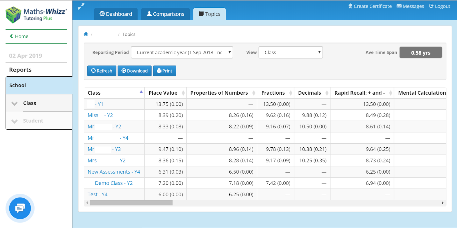 The Topics tab is the last tab that is found in school reports. Similar to the dashboard and comparisons tabs, the information that is presented will be according to the reporting period that is set. The view can also be changed from class to year group. A list of topics are presented alongside the Maths-Ages that the class or year group is in according to that topic.