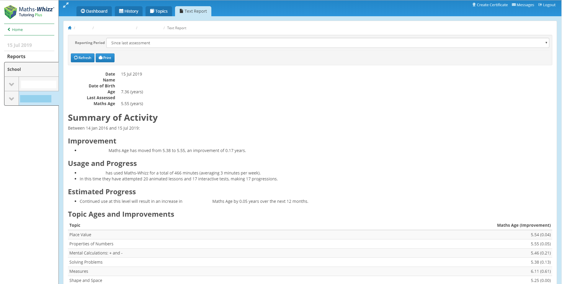 The student’s text report is the last tab that is found in the student report. It provides a written breakdown of the student’s progress according to the reporting period that is set.