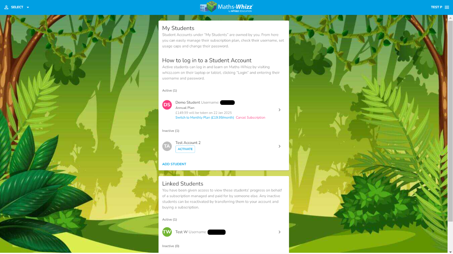 The Students tab is the second tab in the menu. If you have a home subscription, this tab displays the student(s) on your subscription plan. If you have a subscription through a school, it shows your 'Linked Students.' The page will indicate which of your children are active and which ones are inactive.