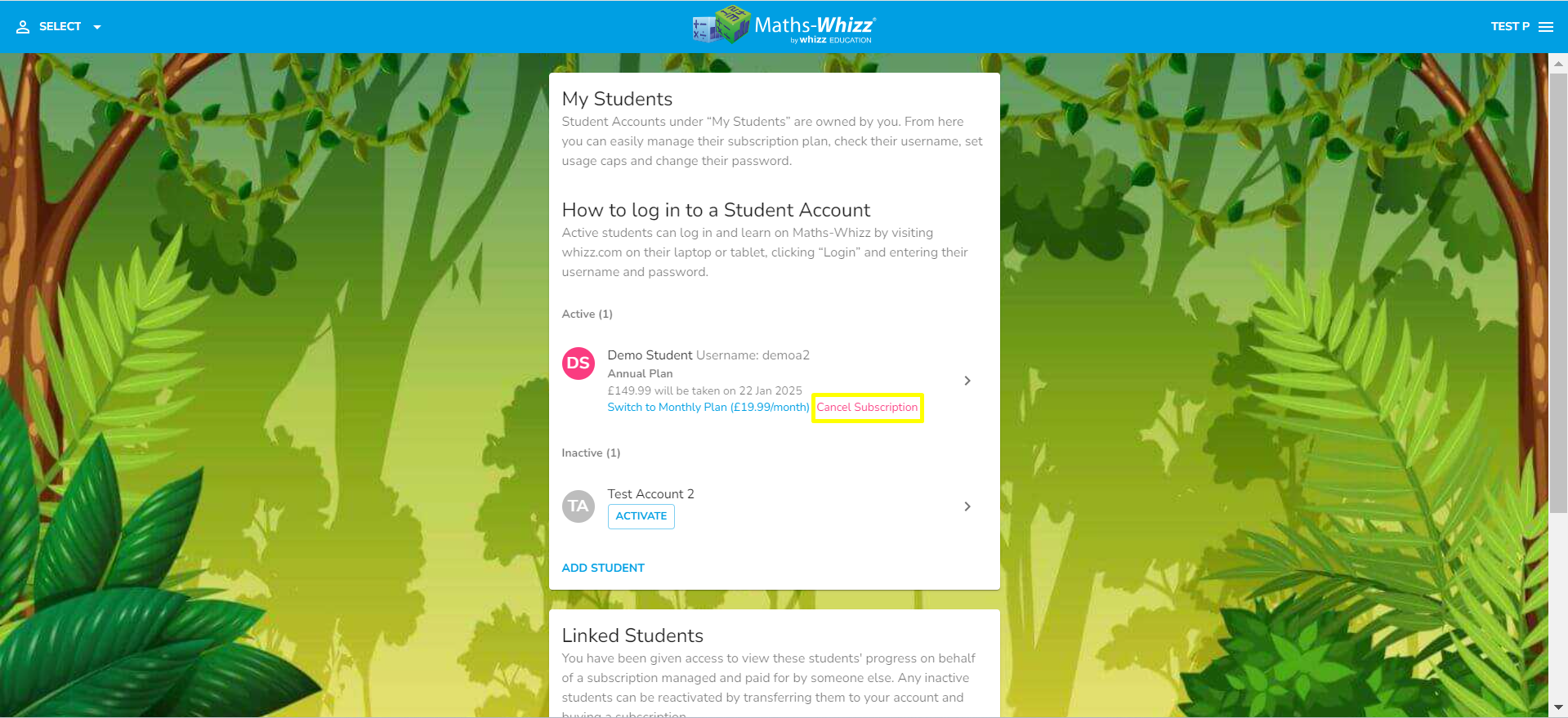 You can also cancel your subscription to prevent automatic renewal by clicking on 'Cancel Subscription' under the name of the student whose subscription you would like to cancel.