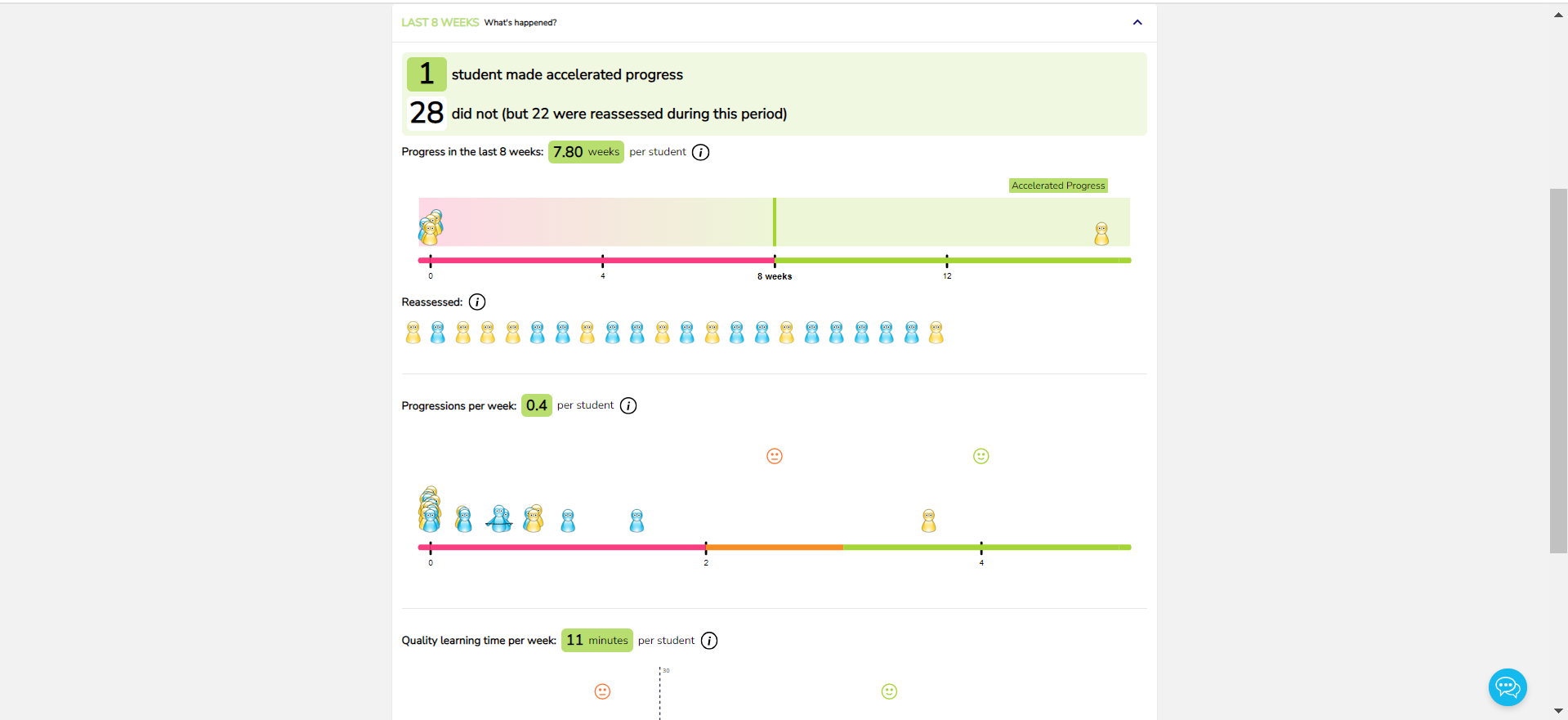 If a student has been reassessed during the last 8 weeks, they will not appear on the progress line but will be shown on a separate line below. However, the student will still appear in the Usage and Progressions categories. Once the reassessed student has 8 weeks of progress data from the reassessment date, they will reappear on the progress line.