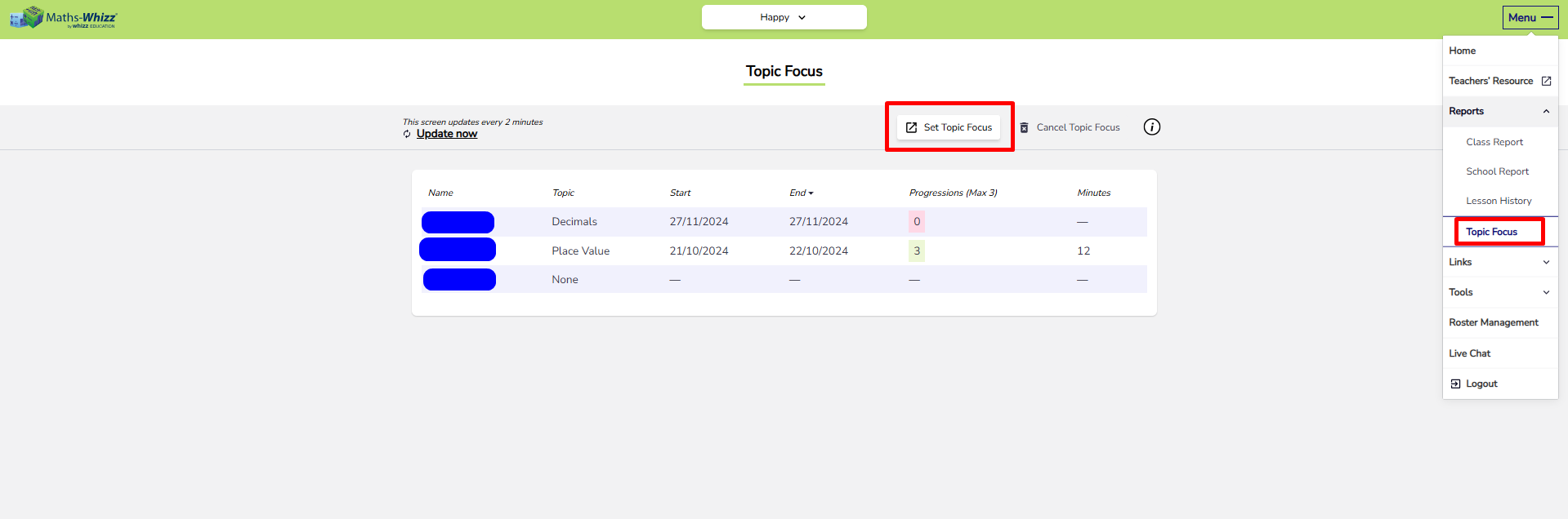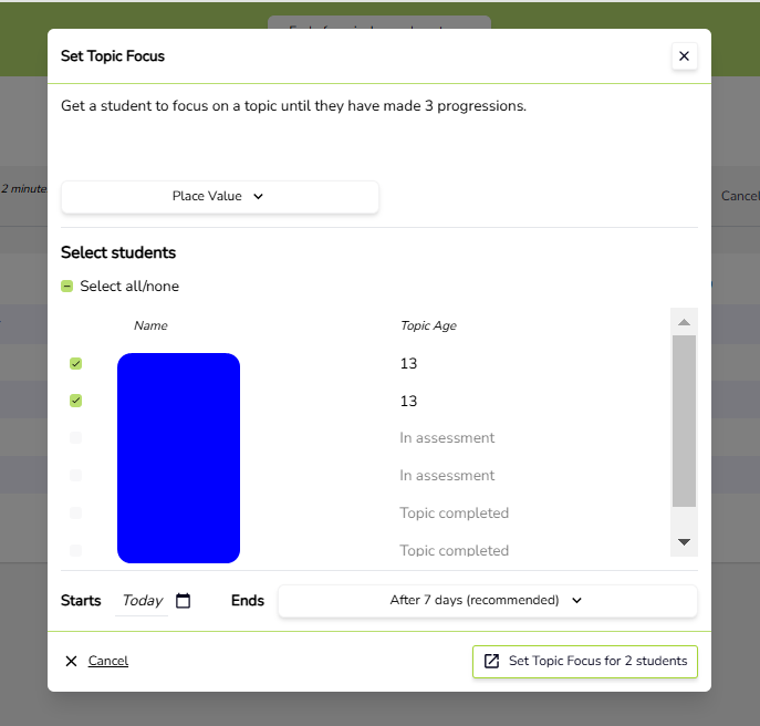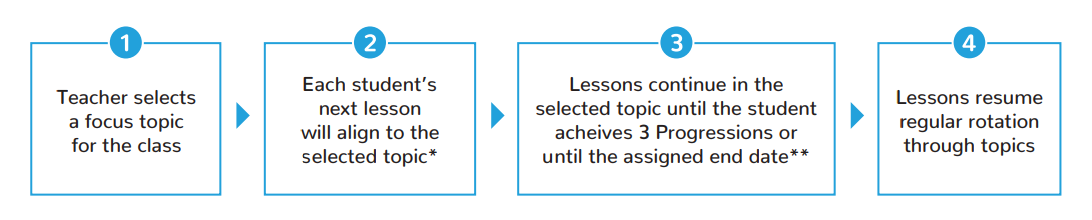 Topic Focus can be found under Reports on the menu. Students listed as ‘Not ready for this topic’ or ‘Topic Completed’ will continue to receive lessons from all available topics. Lessons in the selected topic will continue until the student achieves three progressions or until the assigned end date, whichever comes first. Topic Focus will also end if the student completes the topic with fewer than three progressions, or if the teacher cancels the Topic Focus before it concludes.