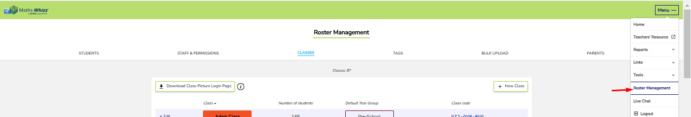 2. You can find the 9-digit class code for your class on the homepage of your teacher account or in Roster Management under the Classes tab.