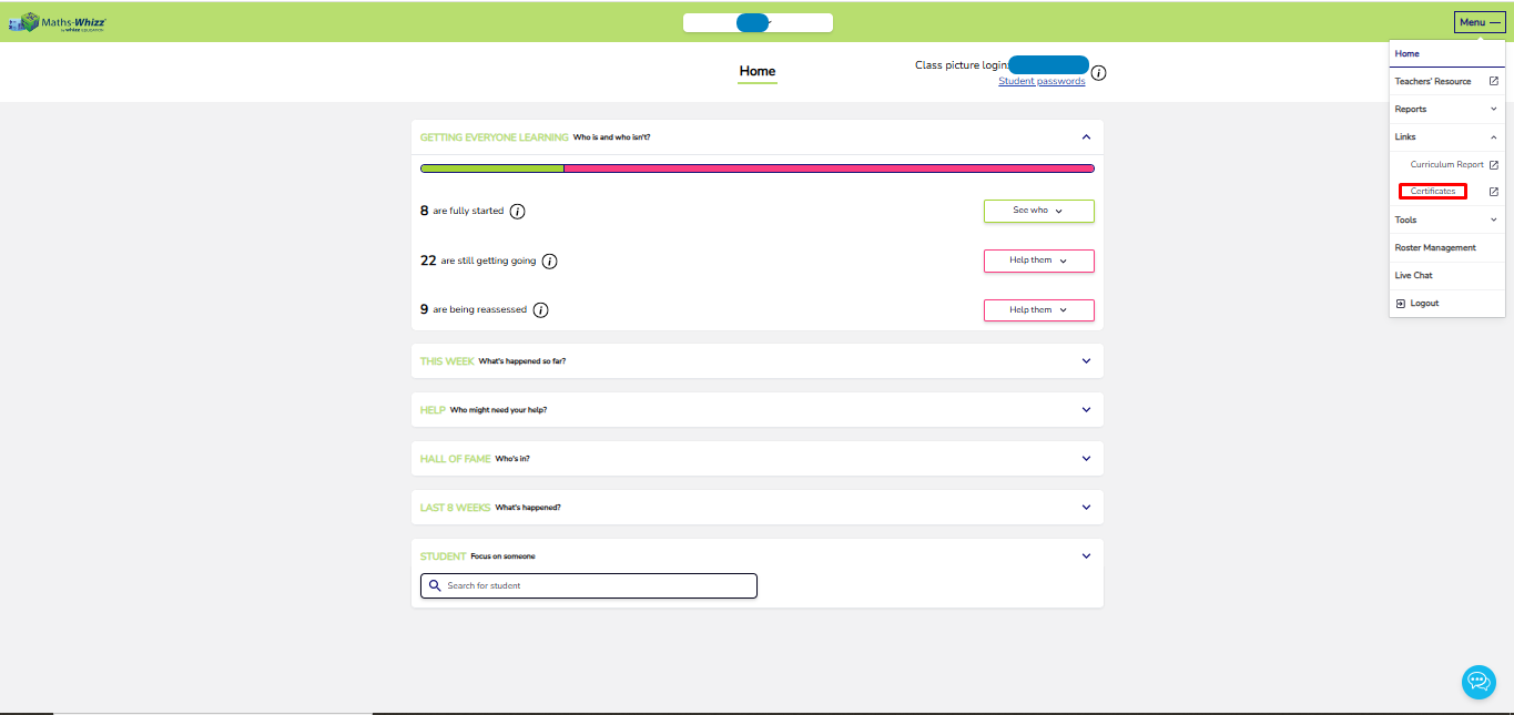 The Certificates option, found under the Links dropdown in the menu, allows you to create customised certificates for students. When you click on it, a new page opens with tools to customise the certificate for the student. This is a great tool for motivating students.